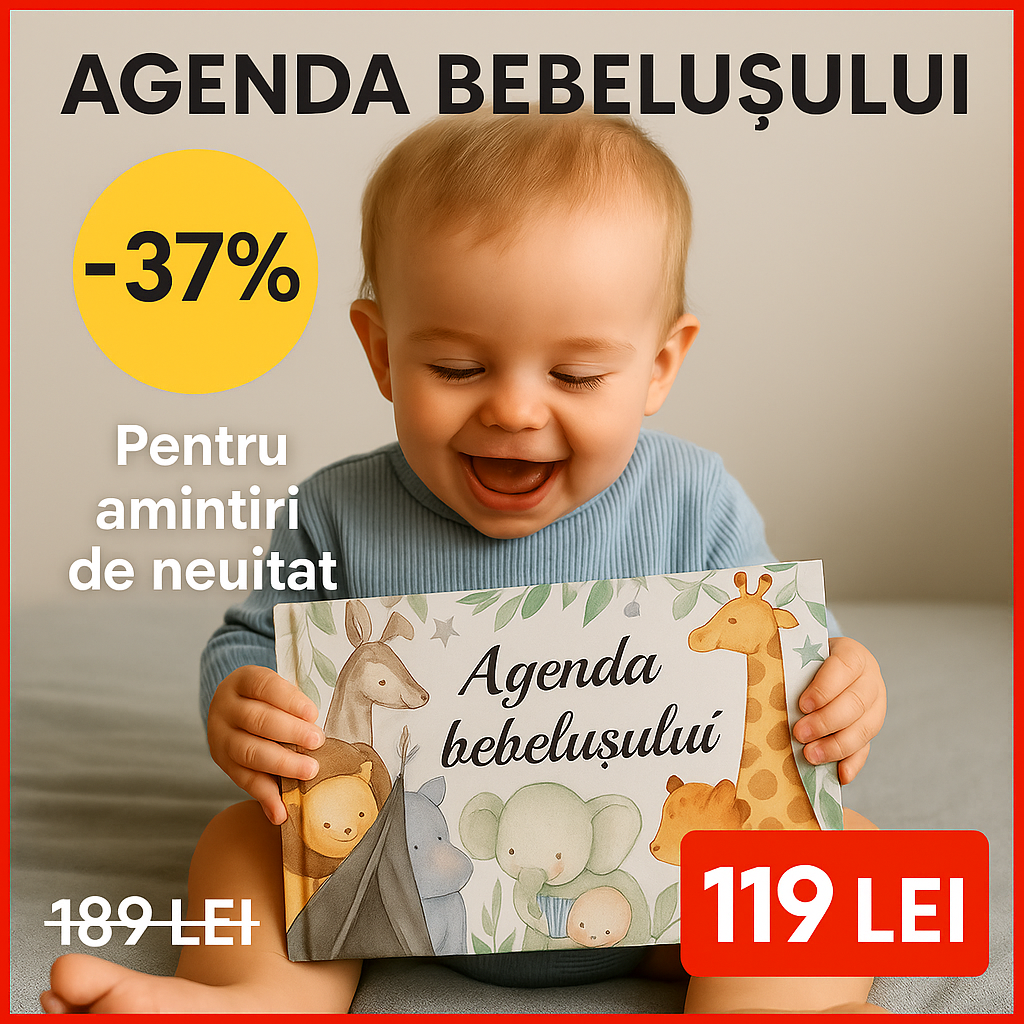 „Agenda Bebelușului” este jurnalul complet al primilor ani de viață, creat pentru a păstra momentele esențiale din creșterea copilului – de la primul zâmbet la primii pași. Cu un sistem flexibil de prindere, permite adăugarea de pagini și amintiri personale, devenind o arhivă unică a copilăriei.